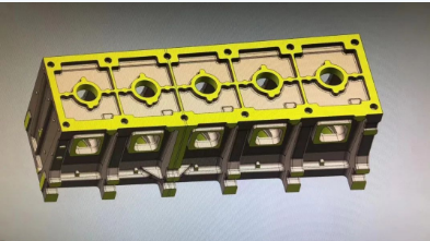 5X72DF氣缸體作為某型低速柴油機(jī)大型鑄件,單件液重達(dá)40噸以上、主要壁厚大于400mm,其壁厚關(guān)鍵部位強(qiáng)度、硬度指標(biāo)要求更高,鑄造工藝難度更大,對(duì)于陜柴鑄造能力提出了新的挑戰(zhàn)與考驗(yàn)。