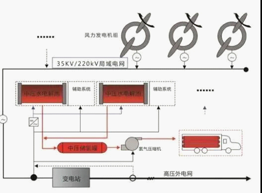 風(fēng)電制氫技術(shù)是將風(fēng)能通過風(fēng)力發(fā)電機(jī)轉(zhuǎn)化成電能,電能通過電解水制氫設(shè)備轉(zhuǎn)化成氫氣,通過將氫氣輸送至氫氣應(yīng)用終端,完成從風(fēng)能到氫能的轉(zhuǎn)化。根據(jù)風(fēng)電來(lái)源的不同,可以將風(fēng)電制氫技術(shù)分為并網(wǎng)型風(fēng)電制氫和離網(wǎng)型風(fēng)電制氫兩種。并網(wǎng)型風(fēng)電制氫是將風(fēng)電機(jī)組接入電網(wǎng),從電網(wǎng)取電的制氫方式,比如從風(fēng)場(chǎng)的35kV或220kV電網(wǎng)側(cè)取電,進(jìn)行電解水制氫,主要應(yīng)用于大規(guī)模風(fēng)電場(chǎng)的棄風(fēng)消納和儲(chǔ)能。離網(wǎng)型風(fēng)電制氫是將單臺(tái)風(fēng)機(jī)或多臺(tái)風(fēng)機(jī)所發(fā)的電能,不經(jīng)過電網(wǎng)直接提供給電解水制氫設(shè)備進(jìn)行制氫,主要應(yīng)用于分布式制氫或局部應(yīng)用于燃料電池發(fā)電供能。