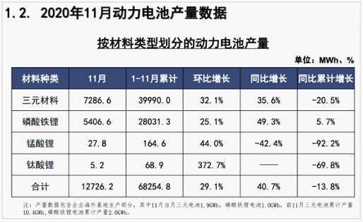 另外,中國汽車動力電池產(chǎn)業(yè)創(chuàng)新聯(lián)盟發(fā)布的數(shù)據(jù)顯示,11月,我國動力電池產(chǎn)量共計12.7GWh,同比增長40.7%,環(huán)比增長29.1%。其中三元電池產(chǎn)量7.3GWh,占總產(chǎn)量57.3%,同比增長35.6%,環(huán)比增長32.1%;磷酸鐵鋰電池產(chǎn)量5.4GWh,占總產(chǎn)量42.5%,同比增長49.3%,環(huán)比增長25.1%。1-11月,我國動力電池產(chǎn)量累計68.3GWh,同比累計下降13.8%。其中三元電池產(chǎn)量累計40.0GWh,占總產(chǎn)量58.6%,同比累計下降20.5%;磷酸鐵鋰電池產(chǎn)量累計28.0GWh,占總產(chǎn)量41.1%,同比累計上升5.7%。