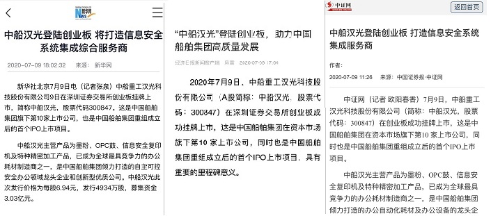 中船漢光成功上市在業(yè)內(nèi)引起強(qiáng)烈反響,新華社、經(jīng)濟(jì)日?qǐng)?bào)以及中國(guó)證券報(bào)等主流媒體紛紛進(jìn)行了報(bào)道。