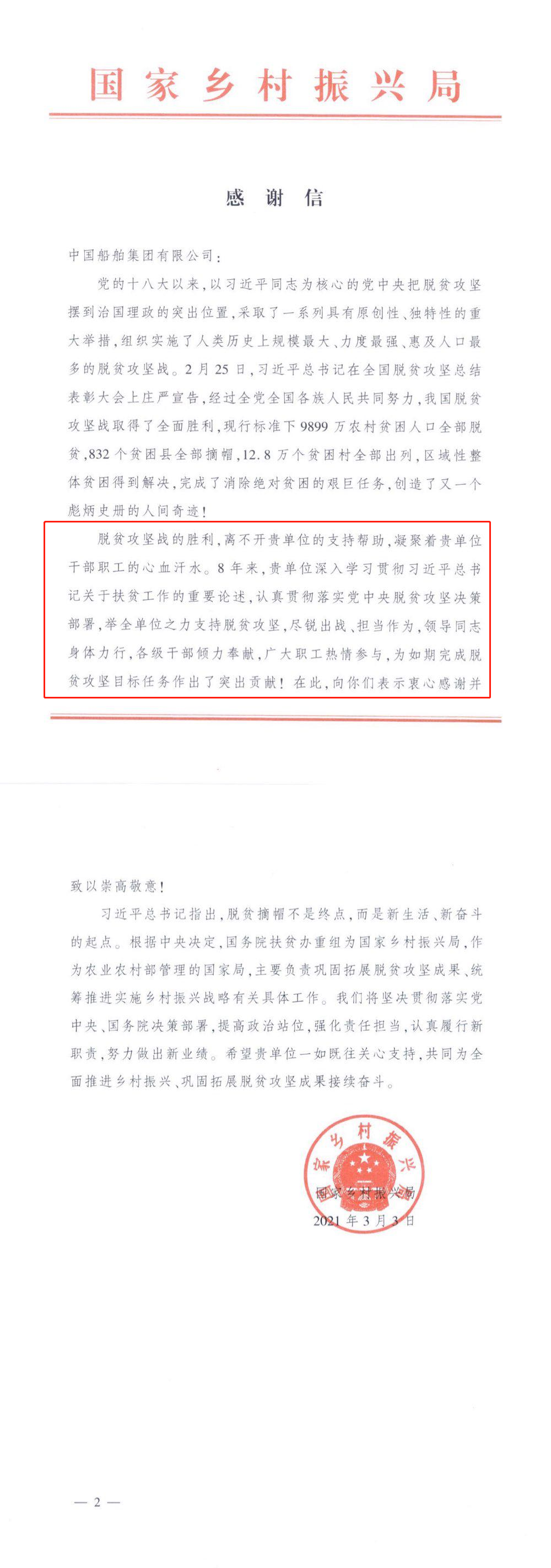 日前,中國船舶集團收到一封特殊的感謝信。信中對中國船舶集團8年來的擔當作為、傾情奉獻表示感謝和敬意,這封信來自不久前剛剛掛牌的國家鄉(xiāng)村振興局。