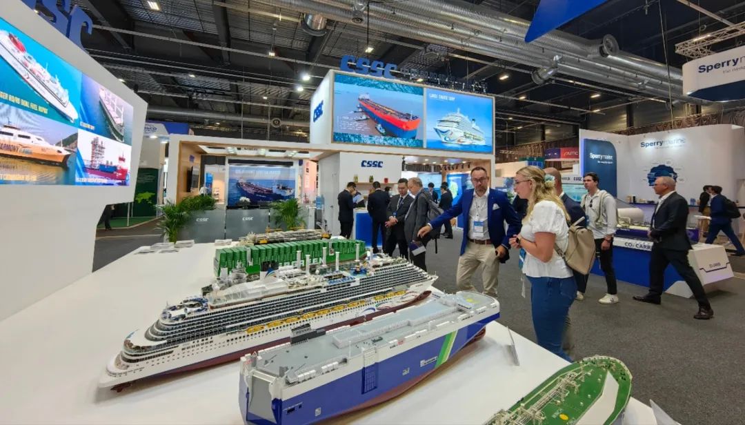 本次展會,中國船舶集團積極踐行“走出去”發(fā)展戰(zhàn)略,緊盯目標市場特點和需求,重點展示了近年來船舶海工及動力機電產(chǎn)品在綠色、低碳、環(huán)保方面取得的最新進展和相關(guān)成果,包括全球首制7500立方米液態(tài)二氧化碳運輸船、17.4萬立方米大型LNG運輸船、7000CEU雙燃料汽車滾裝船、23000TEU超大型雙燃料集裝箱船、21萬噸氨燃料散貨船、30萬噸級FPSO、全球首艘10萬噸級智慧養(yǎng)殖工船,以及 12X92DF雙燃料低速機、LNG供氣系統(tǒng)、船用碳捕捉系統(tǒng)等。集團公司展臺吸引了眾多國內(nèi)外知名船東、船級社、設(shè)備廠商等到訪觀摩,交流了當前市場熱點并探討了未來合作機遇。