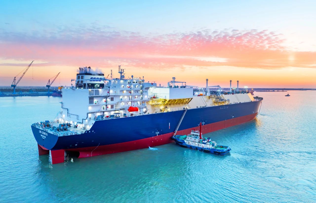 晚霞的天空,碧波的水面,一艘LNG船正航行于天地之間,色彩猶如天成。