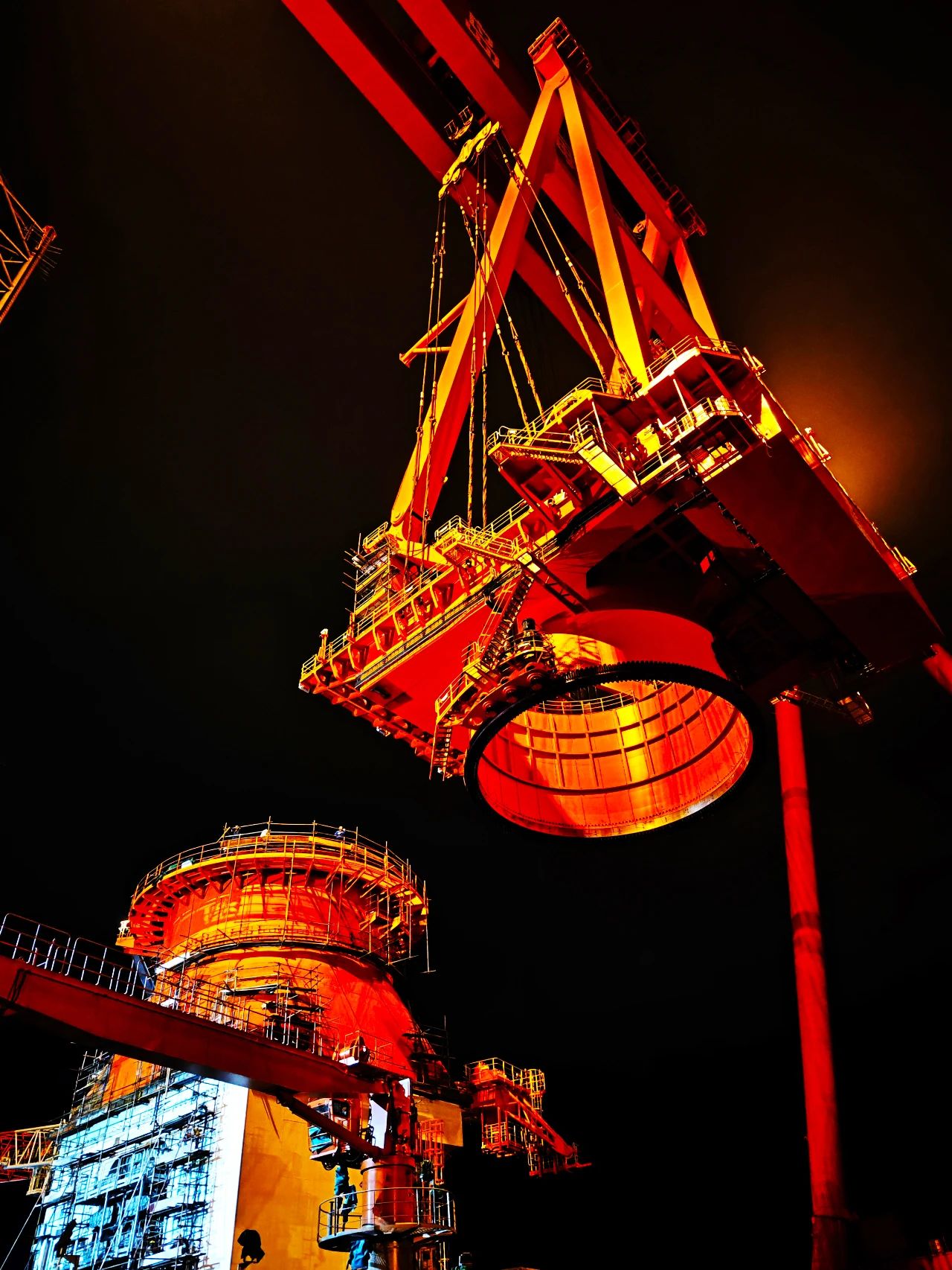 在武漢船機(jī)平臺(tái)總裝現(xiàn)場(chǎng),華夏金租神大平臺(tái)配套的1200噸起重機(jī)正在安裝,大件吊裝各項(xiàng)準(zhǔn)備工作繁瑣,一切就緒時(shí),天已經(jīng)黑了,現(xiàn)場(chǎng)一鼓作氣開始吊裝對(duì)接,展現(xiàn)了船舶人只爭(zhēng)朝夕、不負(fù)韶華、忘我工作精神風(fēng)貌。