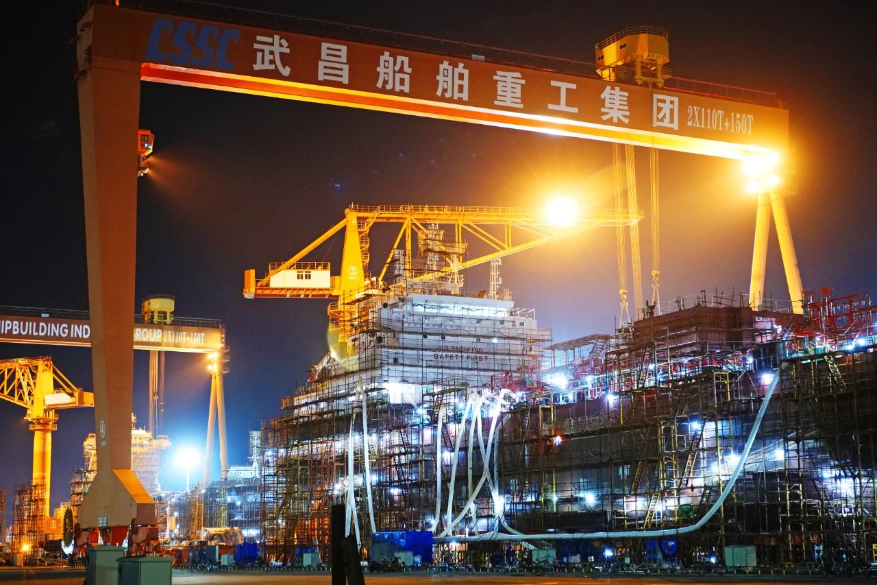 照片攝于國(guó)產(chǎn)首艘大型郵輪首次出塢前夕,拍攝時(shí)期為傍晚,船塢開啟燈光照明,工人在對(duì)船身做最后的涂裝修飾工作。這樣的角度觀看國(guó)產(chǎn)首艘大型郵輪令人無(wú)比震撼。