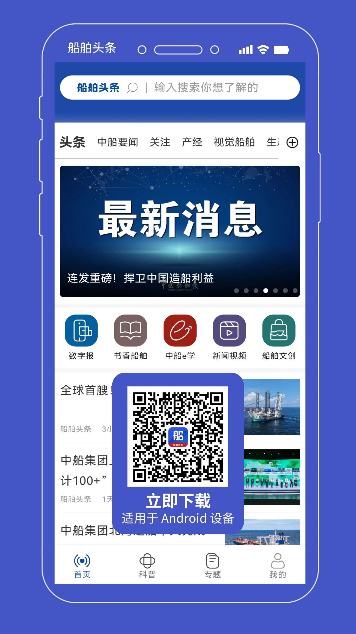 “船舶頭條”App聚焦海洋裝備產(chǎn)業(yè)鏈,集新聞發(fā)布、融合傳播、專業(yè)解讀、科普宣傳、企業(yè)智庫(kù)、服務(wù)聚合等功能為一體,設(shè)有“頭條”“中船要聞”“關(guān)注”“產(chǎn)經(jīng)”“視覺(jué)船舶”“生態(tài)圈”6個(gè)精品頻道以及“科普”“專題”等功能版塊,并鏈接“書香船舶”“《中國(guó)船舶報(bào)》數(shù)字報(bào)”“中船e學(xué)”“新聞視頻”“船舶文創(chuàng)”等多個(gè)服務(wù)端口,目前支持安卓系統(tǒng)下載使用。