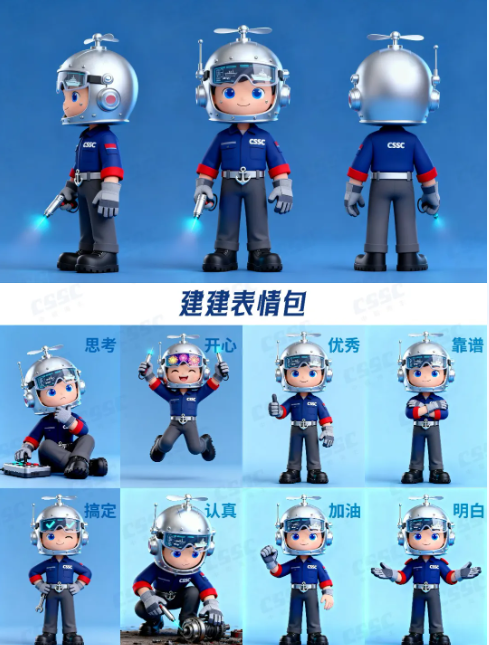 建建(造船擔當)以銀色防護頭盔(嵌船舶零件電子屏、印艦船剪影)、船錨腰帶、CSSC工裝及焊槍,凸顯造船匠心精神;航航(航行擔當)憑船舵頭飾、導(dǎo)航羅盤、海鷗披風與船錨上衣,傳遞中船航行使命。二者以 “建造 - 航行” 閉環(huán),具象中船全鏈條實力,彰顯中船文化。