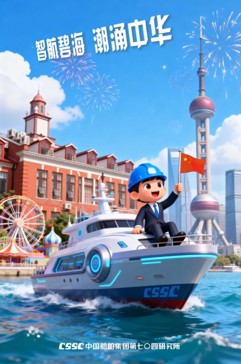 海報以七〇四所標志性建筑“小紅樓”和上海市地標為背景,AI 生成的卡通工程師乘坐智能船舶破浪前行,手持國旗彰顯科技自信。